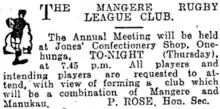 - ↑ "The Mangere Rugby League Club". New Zealand Herald, Volume LXVII, Issue 20518. 20 March 1930. p. 20. Retrieved 28 March 2023.