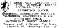 When the 18 player Auckland Junior representative squad was named to play the South Auckland team on May 31, T Tapi and Clark from Māngere were included.[131] In September a Senior B representative side was chosen to play a benefit match at Sturges Park in Otahuhu to raise money for Mr. W. McManus. Lou Wilson of the Māngere side was selected to play amongst the backs along with Roberts in the forwards.[132] Then in mid October the Māngere side played an Auckland Junior representative team at Onehunga Reserve (Waikaraka Park) in an exhibition match.[133]