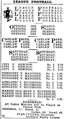 - ↑ "League Opening". Sun (Auckland), Volume III, Issue 647. 26 April 1929. p. 8. Retrieved 28 March 2023.
