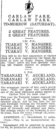[175] Then on June 30 the Tuakau club played Māngere in their return match at Carlaw Park. Albert Asher, former New Zealand rugby league player from 1910 to 1913 and All Black in 1903 had been involved in preparing the Tuakau side. Asher had also represented the New Zealand Māori side from 1908 to 1910.[176] The Māngere side listed to play was similar to the one which had played previously and was: Johnson, Roberts, Wilson, Haslett, Jacobs, Rau, and Harvey in the backs, with H. Roberts, Grubb, W. Roberts, Heri, Paul, Nightingale in the forwards with B. Rau, Rickards, Jones, and Marshall the emergency players.[177] The side which took the field was slightly different with two Wilson’s playing, Lou on a wing with Jack Wilson at centre. Tuakau turned the tables and won the match 11-10. After the match the Tuakau side was entertained by Māngere at Onehunga.[178][179] At the July 4 meeting of the league the Māngere club was thanked for their services in connection with the match.[180]
