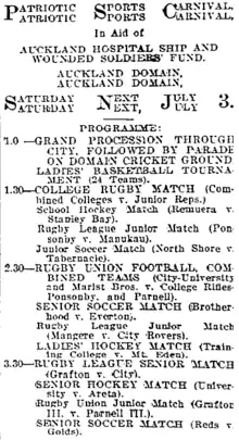 - ↑ "Saturday Week's Fixture". Auckland Star, Volume LXIV, Issue 229. 28 September 1933. p. 18. Retrieved 31 March 2023.