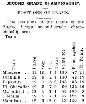 In July the Māngere club was involved in a controversy with the Manukau Rovers club. It resulted in the entire Manukau club switching to rugby union in protest at their treatment by the Auckland Rugby League. One of their players, M. King, had played for Māngere with them allegedly knowing but not reporting it to the league.[61] The club was censured by the league and quit, citing unfair treatment.[62] Their other wins were over Ellerslie, 19-8 at the Ellerslie Reserve in round 10 and against Athletic 20-19 in round 16. This was their best win of the season with Athletic finishing 4th, and came after Paul “scored a sensational try” on full time to win the match.[63] This appears to be their final match in the championship with their round 17 match with Ponsonby cancelled due to both sides having players involved in the Auckland representative match in Hamilton. Māngere finished with a 5 win, 9 loss recorded, scoring 154 and conceding 252 to finish in 6th position out of 9 teams. Their season came to an official end when they fielded 12 players and lost to Ponsonby 24-5 in the Roope Rooster knockout competition.[64] Ultimately this was to be their only ever appearance in the Roope Rooster competition.
