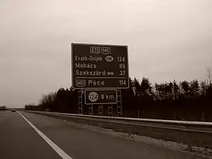 The southernmost Bóly - Ivándárda (border crossing with Croatia) section is currently under construction with a planned inauguration date in 2024.[1] The connecting segment of the A5 in Croatia is also under construction, with the completion scheduled for 2023.[2]