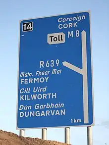 The M8 motorway (Irish: Mótarbhealach M8) is an inter-urban motorway in Ireland, which forms part of the motorway from the capital Dublin to Cork city. The 149 km motorway commences in the townland of Aghaboe, County Laois and runs through the counties of Kilkenny, Tipperary and Limerick, terminating at the Dunkettle interchange in Cork City. First called for in the Road Needs Study (1998), it was later incorporated into the National Development Plan (2000–2006) and later still formed part of the Irish Government's Transport 21 plan for infrastructural development.[1] The majority of the M8 (115 km) was built between 2006 and 2010. On 28 May 2010, the motorway was completed and had replaced almost all of the single-carriageway N8 except for a short section of urban road in Cork City.[2][3]