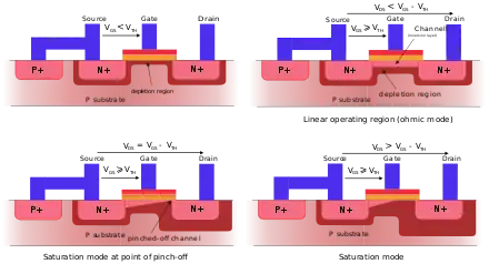 where is the charge-carrier effective mobility, is the gate width, is the gate length and is the gate oxide capacitance per unit area. The transition from the exponential subthreshold region to the triode region is not as sharp as the equations suggest.[21][22]
