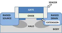 When a negative gate-source voltage (positive source-gate) is applied, it creates a p-channel at the surface of the n region, analogous to the n-channel case, but with opposite polarities of charges and voltages. When a voltage less negative than the threshold value (a negative voltage for the p-channel) is applied between gate and source, the channel disappears and only a very small subthreshold current can flow between the source and the drain. The device may comprise a silicon on insulator device in which a buried oxide is formed below a thin semiconductor layer. If the channel region between the gate dielectric and the buried oxide region is very thin, the channel is referred to as an ultrathin channel region with the source and drain regions formed on either side in or above the thin semiconductor layer. Other semiconductor materials may be employed. When the source and drain regions are formed above the channel in whole or in part, they are referred to as raised source/drain regions.
