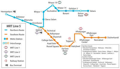 The MRT Line 5 (Bengali: এমআরটি লাইন ৫, romanised: Em-Ar-Ti Lain Pachh) is an approved mass rapid transit line of Dhaka Metro Rail. It will be the third line of the Dhaka Metro Rail system. This line comprises Northern Route and Southern Route. The construction of the MRT Line 5's Northern Route began in 5 November 2023 and is scheduled to commence operation by 2028.[1]