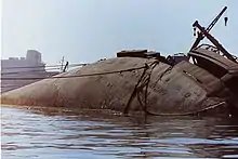 On 27 August 1980 disaster struck. During her reconstruction, a fire broke out on board. It spread very rapidly, quickly consuming the ageing liner, and overnight she rolled over to starboard, coming to rest on the bottom of the shallow harbour. Her wreck still remained in her original position. [3]
