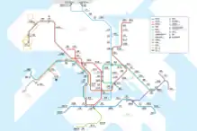 The Mass Transit Railway (MTR) is a major public transport network serving Hong Kong. Operated by the MTR Corporation Limited (MTRCL), it consists of heavy rail, light rail, and feeder bus service centred on a 10-line rapid transit network serving the urbanised areas of Hong Kong Island, Kowloon, and the New Territories. The system included 245.3 km (152.4 mi) of rail as of December 2022 with 179 stations, including 98 heavy rail stations, 68 light rail stops and five high-speed rail terminus.[1][2]