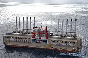 Converted into a power barge by Sedef Shipyard in Tuzla, Istanbul in 2013, she was renamed Fatmagül Sultan after the sister of Karadeniz Holding's chairperson.[3] Equipped with eleven electric generators,[5] four high-voltage transformers and operated by a crew of sixty technicians and engineers, the Powership has an installed generation capacity of 202 MW on dual-fuel (HFO- and gas-fired).[6] The Powership's fuel tanks capacity allows her to generate ten days long uninterrupted power.[4][7]