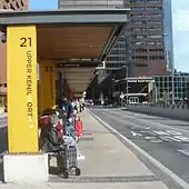 The Hamilton Street Railway bus terminal is located between King St W and Main St W, on a section of the street closed to traffic. Once a through street north of King Street, the demolition of buildings for Jackson Square would give rise to an on street transit terminal after 1969. The pre-2011 terminal had seven platforms with ten routes, mostly serving the upper part of the city. The 9 platform terminal was rebuilt and re-opened on 2 January 2011.[11] Formerly known as McNab Transit Terminal, the terminal was renamed to the Frank A. Cooke Transit Terminal on September 12, 2022 in honor of Franklin Arthur Cooke, the former general manager of HSR from 1946 to 1985.[12][13]