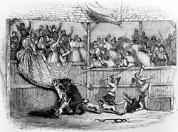 In one scene, Macbeth's court hosts bear-baiting, a form of entertainment in the Middle Ages in which a bear and dogs are pitted against each other. Williams suggested the scene communicates Macbeth and Lady Macbeth's growing callousness after taking power,[13] while Kenneth S. Rothwell and Morrison matched the scene to Shakespeare's Macbeth describing himself as "bear-like".[14][15]
