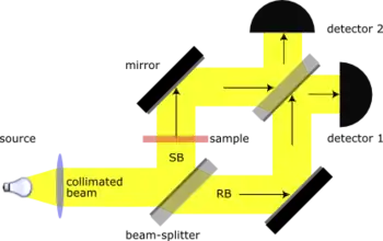The collimated beam is split by a half-silvered mirror. The two resulting beams (the "sample beam" and the "reference beam") are each reflected by a mirror. The two beams then pass a second half-silvered mirror and enter two detectors.