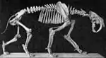 The scimitar-toothed machairodonts (Machairodontini, Homotherini and Metailurini) are a much more diverse group. The canines of this larger group are significantly shorter and generally stouter, but still much longer than in any modern cat. Because of the diversity of the genera, it is difficult to illustrate a specific type. The Machairodontini were the first among the machairodontines and the felids overall to attain near-lion size and already showed impressive upper canines early on in their evolution in the Miocene, but apart from these retained a relatively cat-like morphology that was more similar to modern pantherines than more derived machairodontines from later periods. Machairodus appears to have been an excellent jumper. The homotherines were overall more specialized and already the earliest taxa like Lokotunjailurus were remarkably long-legged and lean, though as large as a modern lion, a trend that further magnified in the Pliocene-Pleistocene genus Homotherium, which was once thought to be plantigrade, but was proven to be digitigrade.[14] Homotherium serum, the most derived known species from the Pleistocene of North America bore a sloped back that might have made it excellent at running long distances, similar to the living spotted hyena. It also had a well-developed visual cortex, a large nasal cavity that would have allowed for better oxygen intake and smaller, only partially retractable claws that might have functioned like spikes for a better grip on the ground, all of which seems to point to a highly active lifestyle and cursoriality.[30] Xenosmilus however, a mid-Pleistocene homotherine from Florida and close relative of Homotherium, broke this trend in that it had both scimitar-like teeth and a bulky and strong build that is more typical for dirk-tooths.[31]