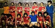 Machine Sazi players with red colours during 1973–74 Takht Jamshid Cup. Later, the team's colours was changed to yellow, blue and then green
