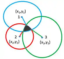 A simple algorithm that can be used for location estimation is the triangulation method (Figure 2). Consider the odor detection equation above, the position of the odor source can be estimated by organizing sensor distances on one side of the equation and ignoring the noise. The source position can be estimated using the following equations: