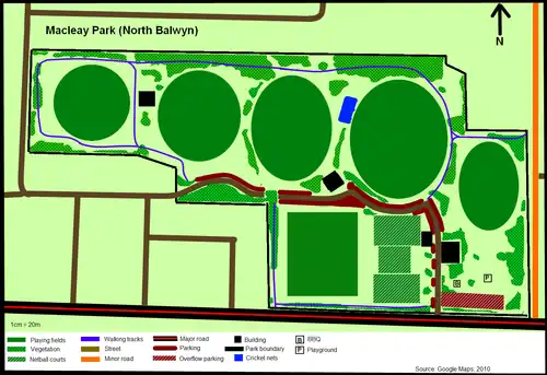 In 1923, the Camberwell City Council acquired the land on which the park stands today.[2] In its early years, the parkland was known as Myrtle Park. The North Balwyn Cricket Club was established in 1927,[3] followed by the North Balwyn Baseball Club in 1937.[4]