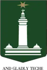 The escutcheon (in green taken from the tartan of Clan MacQuarrie) displays the Macquarie Lighthouse tower, the first major public building in the colony when completed in 1816, as well as the Sirius star (in gold), which was also the name of the flagship of the First Fleet. The motto chosen for the university, which following the rules of English heraldry does not form part of the original grant of arms, was And Gladly Teche, a phrase taken from the general prologue of The Canterbury Tales by Geoffrey Chaucer (circa 1400), and symbolises the university's commitment to both learning and teaching.[36]