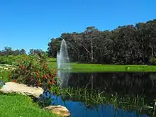 Prior to the development of the campus, most of the site was cultivated with peach orchards, market gardens and poultry farms.[40] The university's first architect-planner was Walter Abraham, one of the first six administrators appointed to Macquarie University.[9] As the site adapted from its former rural use to a busy collegiate environment, he implemented carefully designed planting programs across the campus. Abraham established a grid design comprising lots of 300 square feet (28 m2) running north–south, with the aim of creating a compact academic core. The measure of 300 feet (91 m) was seen as one minute's walk, and grid design reflected the aim of having a maximum walk of 10 minutes between any two parts of the university. The main east–west walkway that runs from the Macquarie University Research Park through to the arts faculty buildings, was named Wally's Walk in recognition of Walter Abraham's contribution to the development of the university.[9]