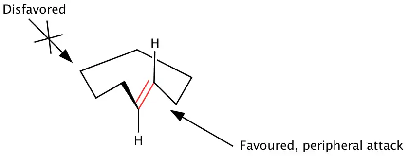 Macrocyclic rings containing sp2 centers display a conformational preference for the sp2 centers to avoid transannular nonbonded interactions by orienting perpendicular to the plan of the ring. Clark W. Still proposed that the ground state conformations of macrocyclic rings, containing the energy minimized orientation of the sp2 center, display one face of an olefin outwards from the ring.[1][9][12] Addition of reagents from the outside the olefin face and the ring (peripheral attack) is thus favored, while attack from across the ring on the inward diastereoface is disfavored. Ground state conformations dictate the exposed face of the reactive site of the macrocycle, thus both local and distant stereocontrol elements must be considered. The peripheral attack model holds well for several classes of macrocycles, though relies on the assumption that ground state geometries remain unperturbed in the corresponding transition state of the reaction.