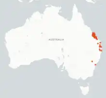 Macrozamia miquelii is endemic to both southern Queensland and northern NSW, from Port Curtis District to the upper Richmond River.[3] The cycad is located on ridges and slopes within sclerophyll forests where eucalyptus tree species including the Corymbia citriodora and Eucalyptus crebra dominate the canopy. Scattered within these forests, the cycad grows on low-nutrient stony or sandy soils at an altitude range of 10 m to 540 m.[4]