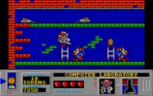 The five laboratories are Biological Observations, Chemical Research Dept., Computer Laboratory, Spacerocket Development and Central Power Control. The first four laboratories may be visited in any order; Central Power Control becomes accessible once the other four have been closed down. The Amiga and Archimedes versions combine horizontal scrolling with vertical flip-screen. The Atari ST version uses flip-screen in both directions.