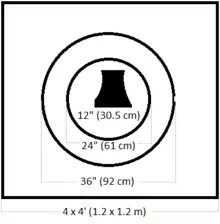 The "Second Class Figure Target" was 48 inches square (approximately 1.2 x 1.2 meters), with 24 in (61 cm) inner and 36 in (91 cm) magpie circles. The aiming mark was a 12 in × 12 in (30 cm × 30 cm) silhouette figure that represented the outline of the head of a man aiming a rifle from a trench. Points were scored by a hit anywhere on the target.