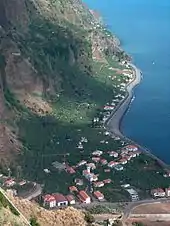 The coastal extent of Madalena do Mar: a strip of cultivated terrace-fields, with several buildings along the ravine and in the escarpment