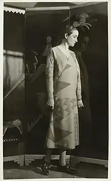 An illustration from 1927 depicts Madame Agnes' Congo inspired hats with a model wearing a slave collar.[6] In December 1935 she introduced hats with large straw brims which were mounted on flowered madras handkerchiefs.[7] Madame Agnes was inspired by a matador's hat when she created a small dinner hat for Spring 1936. It was sewn of black maline with heavy white silk fringe. The fringe was mounted on each side of the hat's top.[8] In mid-1946 she created a soft beige beret of felt which featured a line that was broken just above the right eyebrow, where a soft quill was inserted.[9]