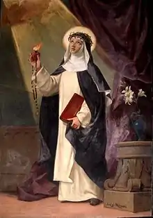 | Attributes | Dominican habit, heart, rosary, crown of thorns |