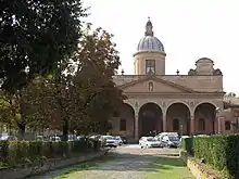 In 1401, during a siege of Bologna by Gian Galeazzo Visconti, an elderly woman was spied kneeling in prayer next to the wall where a Madonna image was present. Suspecting she was voicing secrets through a small gap in the wall, she was arrested, and the town leader, Bente Bentivoglio had a wall built interior to the wall to seal the site. When that wall collapsed soon after construction, Bentivoglio interpreted this as a miracle, had the old woman freed. In 1438 an oratory had been built. By 1497, Giovanni Bentivoglio II had Francesco Cossa repaint the image,[1] (original by Lippo di Dalmasio), and built a portico to shelter the image. In 1524, The church was built with its tympanum with a terracota virgin by Alfonso Lombardi. The porticoed forecourt was added in 1550, and the cupola was added in 1682 on a design by A. Barelli.[2]