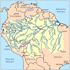![]() The Amazon Basin with the Madre de Dios River highlighted | |