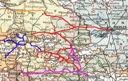 In 1873, the MHE opened the Uelzen–Stendal section of the America Line, and assumed responsibility for the management of the whole line. The MHE acquired of the Magdeburg-Leipzig Railway Company on 17 March 1876.