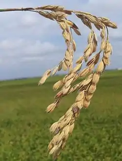 Rice blast has been observed on rice strains M-201, M-202, M-204, M-205, M-103, M-104, S-102, L-204, Calmochi-101, with M-201 being the most vulnerable.[16] Initial symptoms are white to gray-green lesions or spots with darker borders produced on all parts of the shoot, while older lesions are elliptical or spindle-shaped and whitish to gray with necrotic borders. Lesions may enlarge and coalesce to kill the entire leaf. Symptoms are observed on all above-ground parts of the plant.[17] Lesions can be seen on the leaf collar, culm, culm nodes, and panicle neck node. Internodal infection of the culm occurs in a banded pattern. Nodal infection causes the culm to break at the infected node (rotten neck).[18] It also affects reproduction by causing the host to produce fewer seeds. This is caused by the disease preventing maturation of the actual grain.[15]