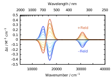 where is the intensity of light at position , is the absorption coefficient of the medium in the direction, and is the speed of light. Circular dichroism (CD) is then defined by the difference between left () and right () circularly polarized light, , following the sign convention of natural optical activity. In the presence of a static, uniform external magnetic field applied parallel to the direction of propagation of light,[2] the Hamiltonian for the absorbing center takes the form for describing the system in the external magnetic field and describing the applied electromagnetic radiation. The absorption coefficient for a transition between two eigenstates of , and , can be described using the electric dipole transition operator as