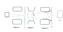Rabi's method was an improvement over Stern-Gerlach. As shown in the figure, the source emits a beam of neutral atoms, having spin angular momentum . The beam passes through a series of three aligned magnets. Magnet 1 produces an inhomogeneous magnetic field with a high gradient (as in Stern-Gerlach), so the atoms having 'upward' spin (with ) will deviate downward (path 1), i.e. to the region of less magnetic field B, to minimize energy. Atoms with 'downward' spin with ) will deviate upward similarly (path 2). Beams are passed through slit 1, to reduce any effects of source beyond. Magnet 2 produces only a uniform magnetic field in the vertical direction applying no force on the atomic beam, and magnet 3 is actually inverted magnet 1. In the region between the poles of magnet 3, atoms having 'upward' spin get upward push and atoms having 'downward' spin feel downward push, so their path remains 1 and 2 respectively. These beams pass through a second slit S2, and arrive at detector and get detected.