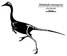Mahakala was a small dromaeosaurid, measuring 50–70 cm (20–28 in) long and weighing 400–700 g (14–25 oz).[1][2] The holotype specimen, IGM 100/1033, consists of a partial skeleton including skull bones, vertebrae, limb bones, and portions of the pelvis and shoulder girdle. Although this individual was small, comparable in size to Archaeopteryx, Caudipteryx, and Mei, it was close to adulthood. This genus can be distinguished from other paravians (dromaeosaurids, troodontids, and birds) by details of the ulna, thighbone, ilium, and tail vertebrae. Like Archaeopteryx and derived dromaeosaurids, but unlike basal troodontids and other dromaeosaurids, the middle (third) metatarsal was not compressed, suggesting that the uncompressed version was the basal version. It had a typical dromaeosaurid form of the second toe, with an expanded claw.[1]
