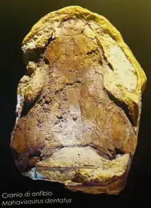 Mahavisaurus is an extinct genus of rhytidosteid temnospondyl from the early Triassic period (Induan stage) of Iraro, Madagascar. It is known from the holotype MNHN MAE 3037, a nearly complete skull, recovered from the Middle Sakamena Formation. This genus was named by J. P. Lehman in 1966, and the type species is Mahavisaurus dentatus.[1]
