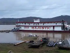 On December 11, 2020, The Ledger Independent reported that the owners were considering docking her in Maysville, Kentucky at Limestone Landing, a riverfront landing in a designated entertainment destination known as The Landing at Limestone quarter of Maysville, after discussions with Augusta, Kentucky broke down.[19] In a special meeting of the city council on December 17, 2020, Maysville City Commissioners learned that Joe Brumley had acquired 100% ownership of the Majestic and had formed a 501 3c non-profit to operate the showboat but the board of directors had been dissolved. The city commission, although was in support of the move, deferred permitting and entering into a lease with Brumley until its non-profit status was resolved and the city knew who it was entering a lease with. Brumley was concerned that the showboat be moved as quickly as possible to prevent damage from Ohio River floods. The showboat was battered with debris during major flooding in early 2020. Brumley claimed that being moored in Manchester is not economically sustainable since the historic winery and tourist attraction, The Moyer Winery, burned down in 2019.[20][21]