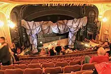 The rear (west) end of the orchestra contains a shallow promenade with doors on either end.[33] The orchestra is raked, but the rear rows contain stadium seating that is more steeply sloped than the front rows. The rearmost row is actually at the mezzanine level above the entrance foyer.[26][28] Halfway through the auditorium's length are exit doors on either side, connected by a wide aisle that separates the front and rear rows.[33] The orchestra and its promenade contain walls with alternating molded and flower/urn panels. Above the paneling, and around the exit signs above the side doors, are moldings with vine decorations.[37] There are brass wall sconces on the orchestra walls. In the orchestra's rear section, the rearmost row has a decorative iron rail behind it, and another iron railing wraps around the front and sides.[34] The front of the orchestra contains rusticated wall surfaces with rectangular openings, which contain staircases to the boxes.[32]