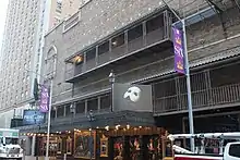 At ground level, the auditorium entrance includes four pairs of glass and aluminum doors to the west and three pairs of metal emergency exit doors to the east. There are also two large, rectangular aluminum-framed sign boards, as well as several smaller aluminum-framed signs with transoms.[23] The entrance is topped by a cast-iron marquee.[23][24] Above that is a sign advertising the production at the theater.[25] Additional doors lead from the stage house portion of the facade. A wide ovolo band runs above the base.[23] The stage door is not actually at the stage house but is instead next to the Golden Theatre.[17]