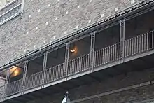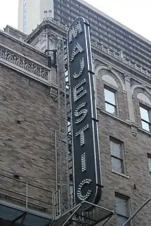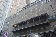 On the upper stories, the auditorium section has two exterior galleries on the second and third floors, which serve as fire exits. The galleries contain wrought-iron frames and railings, which support metal canopies that are designed to resemble Spanish tile roofs. There is a terracotta band course above the lower gallery. The wall of the auditorium section above the upper gallery is laid in brick, with square pieces of terracotta; there are no windows.[23] The upper left corner of the auditorium section, directly above the entrance, has a terracotta Palladian window with a blind opening, twisting columns, an arched tympanum, and a finial.[18][23][22] Near the top of the auditorium facade are false balconettes, which consist of corbels supporting ornamental terracotta railings. The parapet of the auditorium facade contains a terracotta coping. The central part of the pediment has an ornamental finial,[23] similar to that on the Jacobs Theatre.[22]
