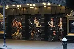 On either side of the proscenium are four boxes on the balcony level, which step down toward the stage.[22][33] The fronts of the first three boxes are shaped like semicircles, while the front of the last box is interrupted by the balcony's front.[33] The boxes' front railings contain molded motifs of talons, waves, and laurel leaves; these motifs are interspersed with urns in arches and cameo panels with dancers. The undersides of the boxes contain molded bands and medallions with overhanging light fixtures. The second box on either side is placed within an arched wall panel; it has a rectangular doorway with a triangular pediment. Flanking the second box on each side are fluted columns, above which is an arched band with acanthus leaves, as well as a coved ceiling panel.[32]