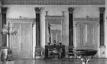 During the Tsarist era, the Malachite Room, which links the state rooms to the private rooms, served as not only a state drawing room of the Tsaritsa, but also as a gathering place for the Imperial family before and during official functions.[2] It was here that Romanov brides were traditionally dressed by the Tsarina before proceeding from the adjoining Arabian Hall to their weddings in the Grand Church.[3]
