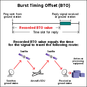 - Burst timing offset (BTO) — The time difference between when a message is sent from the ground station and when the response is received. This measure is proportional to twice the distance from the ground station to the satellite to the aircraft. It includes the time between receiving and responding to the message at the aircraft SDU and the time between receiving and processing the response at the ground station, which are constant and can be calculated and removed. This measure can be analysed to determine the distance between the satellite and the aircraft, resulting in a ring on the Earth's surface that is equidistant from the satellite.[11]: 4–6 [12]: 18