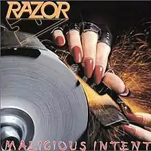 Malicious Intent is the third album released in 1986 by Canadian speed/thrash metal band Razor. The album contains more honed and intense screaming from frontman Stace McLaren and the tracks on it mostly contains lyrics about heroic fantasy and playing heavy metal. An exception to this might be "Tear Me to Pieces", with lyrics penned by McLaren about knife fighting. Malicious Intent is known for containing incredibly loud drum rides and overall poor production. The album itself is an overall turning point for Razor and shows them going from traditional heavy metal and speeding up to a more thrash metal-oriented sound.