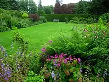 The garden is open to members and paying visitors and consist of a 3-acre (12,000 m2) walled garden set in approximately nine acres of woodland.[8][4][9] The gardens feature four 100-year-old yew trees known as the Four Apostles and was home to Scotland's National Bonsai Collection, which left around 2000 and is now located at Binny Plants near Ecclesmachan.[10] The house is not open to the public.[8] The garden was celebrated in the 17th century for their Dutch-style of gardens.[3] There are over 150 varieties of roses at Malleny, including the National Collection of 19th century Shrub Roses, as recorded by the National Council for the Conservation of Plants and Gardens.[3] The current layout of the garden dates from the mid to late 19th century.[9] The gardens contain two old Victorian glasshouses.[9]