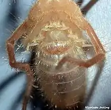 Malleolus (plural: malleoli) is a fan-shaped chemoreceptor or racquet organ, an array of which are carried in pairs on the ventral or undersides of Solpugidae. They are the counterpart of pectines in scorpions, and modified walking limbs in the uropygids and amblypygids as well as the pedipalps in spiders and other arachnids.[1][2] Most species have 5 pairs of malleoli on the ventral surface of the fourth pair of legs of both sexes, while juveniles and other species have 2-3 pairs.[3]