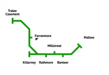 The Mallow–Tralee line runs from Mallow to Tralee Casement. Intermediate stations include Banteer, Millstreet, Rathmore, Killarney and Farranfore.