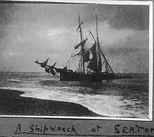 The wooden schooner Malpas Belle, a brigantine (179 tons) built in 1872 by Nicholas Scoble Truro. The boat became stranded on Seaton beach on 3 February 1922 during a voyage from Antwerp to Penarth with a cargo of bog ore on board.